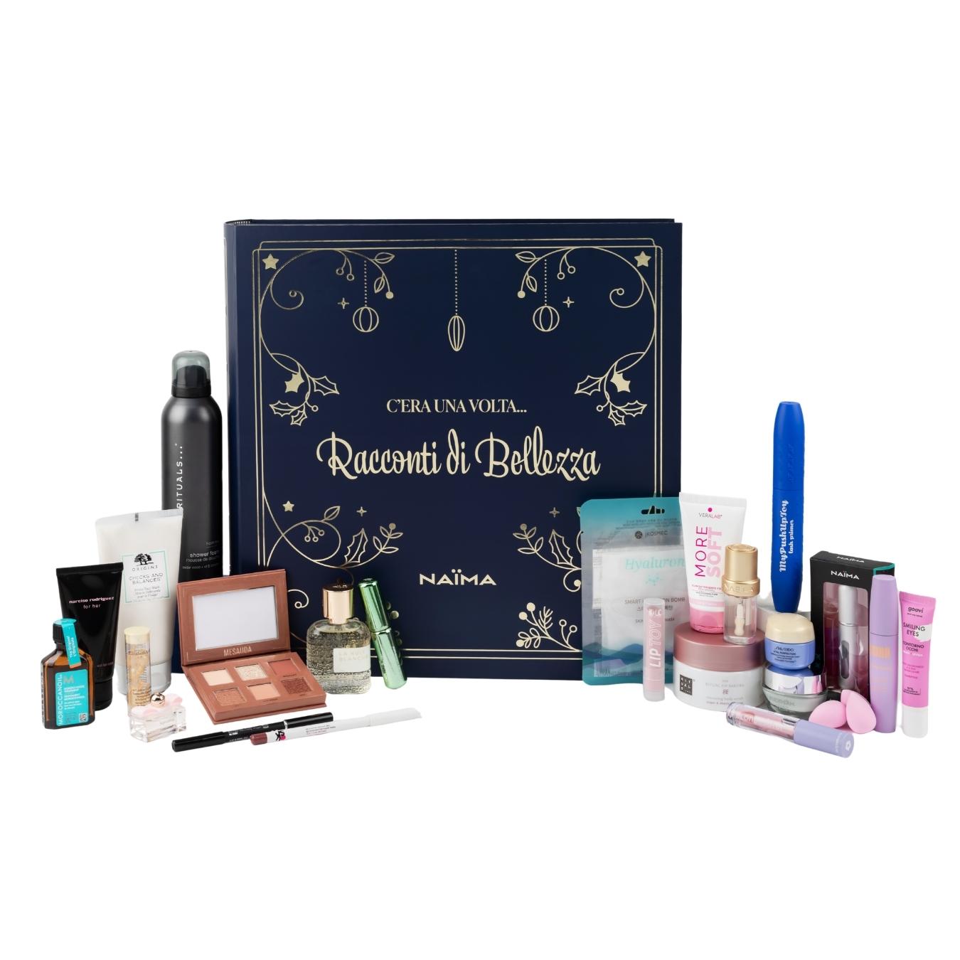 Il valore totale stimato di €401,14 è calcolato sommando i prezzi di vendita al pubblico dei prodotti inclusi nel calendario dell’Avvento, laddove disponibili (NABLA Lip Candy Oil Vanilla 4,5 ml (Esclusiva Naïma) -VERALAB More Soft Travel 50 ml–NARCISO RODRIGUEZ For Her Body Lotion 50 ml – CLINIQUE High Impact High-Fi™Mascara Mini 5 ml – GOOVI Contorno Occhi Smiling Eyes 15 ml - MOROCCANOIL Treatment 25 ml - SHISEIDO Vital Perfection Uplifting and Firming Advanced Cream 15 ml – BIOTHERM Aquasource Hyalu Plump Gel 15 ml – FERRAGAMO Signorina EDP 5 ml – RITUALS Homme Shower Foam 200 ml – RITUALS The Ritual of Sakura Body Scrub 125 g – DIEGO DALLA PALMA MYPUSHUPTOY Lash Primer 13 ml – MULAC Lip Toy 07 Nude Lollipop 2,5 g – MESAUDA Palette Occhi Bare Harmony 204 Delicious Rose 6x1 g – ORIGINS Checks and Balances Detergente Viso 150 ml – NEJHA Volume Docet Mascara Extra Volume 11,5 ml – BLONDESISTER Lip Oil Cute Lippy Coconut 01 2,5 ml – JKOSMEC Skin Solution Hyaluron Mask 25 ml - OVERSKIN Matita Labbra Draw My Lips 05 Mavi Mauve 1,3 g – LPDO La Nuit Blanche Eau de Parfum Intense 30 ml – NAÏMA Set Beauty Blender 7 pz -NAÏMA Vaporizzatore Profumo Ricaricabile 5 ml ), il valore stimato dei prodotti non destinati alla vendita (determinato in base alla quantità di prodotto contenuta, nello specifico PUPA Multiplay Matita Occhi 09 Deep Black 0,8 g e ELIZABETH ARDEN Advanced Light Ceramide Capsules 7 pz) nonché il valore stimato della confezione del calendario.