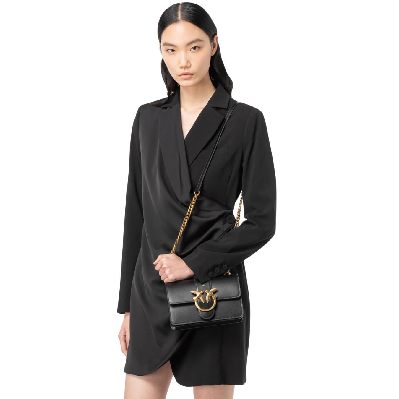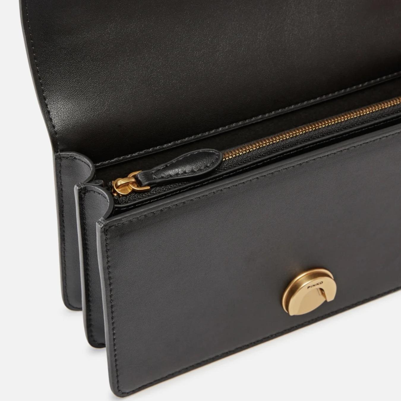 Mini Love Bag Icon in morbida pelle mano seta. La chiusura con baccello in pelle e borchie è completata dall'iconica fibbia in metallo Love Birds Diamond Cut in metallo. L'interno è foderato in microfibra scamosciata e comprende tramezza chiusa con zip e tasca a parete. La tracolla rimovibile combina la classica catena rotonda al pratico spallaccio in pelle regolabile.